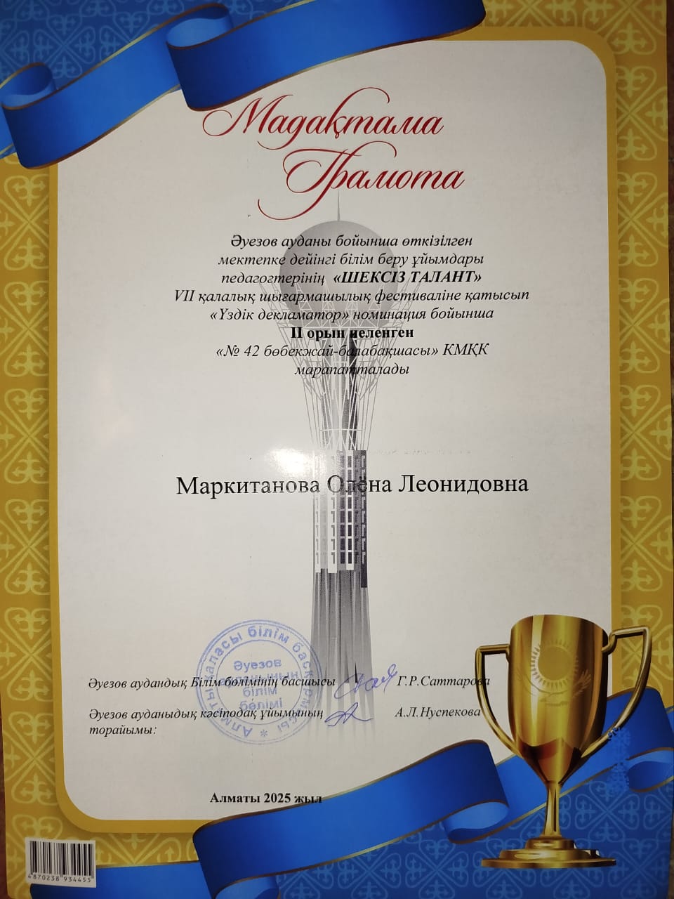 Грамота » ГККП Ясли сад № 42. мемлекеттік балабақшасы